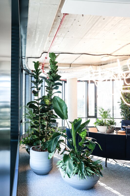 Our Jungle Interiors team won the tender together with S.H.S Architekti, with whom we have already completed several projects. The aim of the project was to bring more life into the interior and create colourful greenery that does not look uniform but naturally complements the character and layout of the interior. We therefore opted for smaller groupings and carefully considered arrangements of plants of various heights, combining both upright and hanging species. The key was to select plants that "communicate" with each other—that is, they have the same light and watering requirements. We had previously worked on several floors in the building where another firm, “CNC”, operates which gave us a perfect idea of those particular lighting conditions and allowed us to tailor the selection of plants precisely to the space.