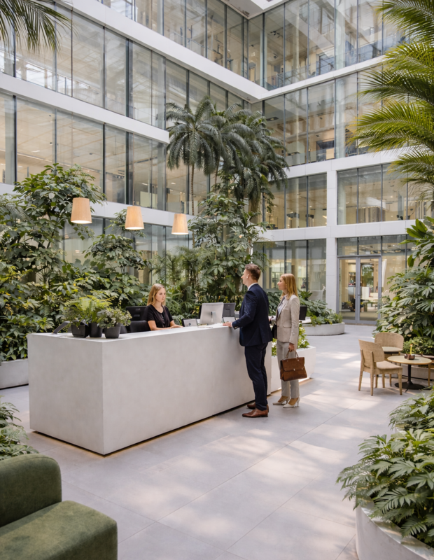 Velké, světlé, zelené atrium se stává přirozeným srdcem budovy. Místem setkávání, klidu, práce i neformálních schůzek. A právě interiérová zeleň dává tomuto prostoru život.